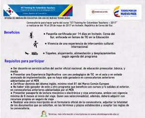 CONVOCATORIA A DOCENTES DEL SECTOR OFICIAL NACIONAL DE EDUCACIÓN PREESCOLAR, BÁSICA Y MEDIA PARA POSTULARSE A UNA PASANTÍA ACADÉMICA EN COREA DEL SUR Términos y condiciones El Ministerio de Educación Nacional convoca a los docentes del sector oficial nacional de educación preescolar, básica y media, a participar por un